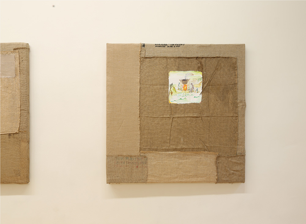 people! people! people! people!nail polish on colored paper, oil and acrylic on potato bagMOM Artspace, Hamburg, DE5 May – 13 May 2018